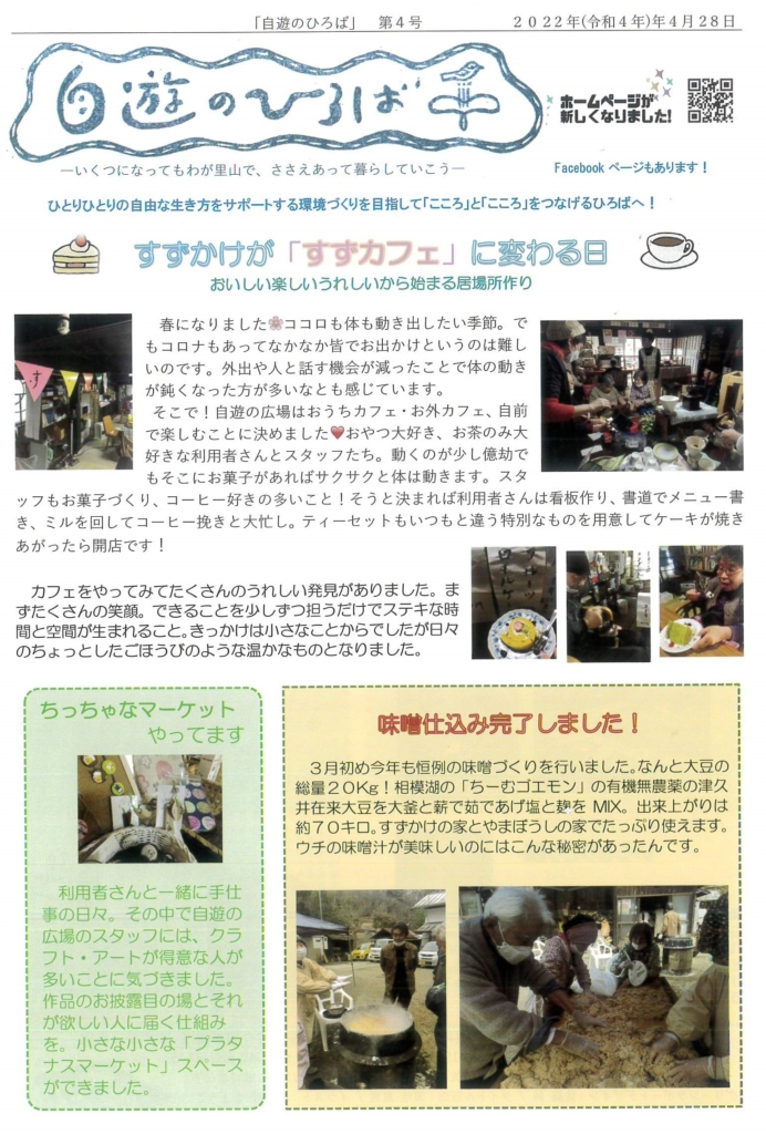 会報「自遊のひろば」第4号ができました! いつもの場所でお出かけ気分を味わう「すずカフェ」、やまぼうしの家の日常の記事などが掲載されています。 藤野や近隣のお店にも置かせていただいています。オンラインで、また手に取って、ぜひご覧ください。→...