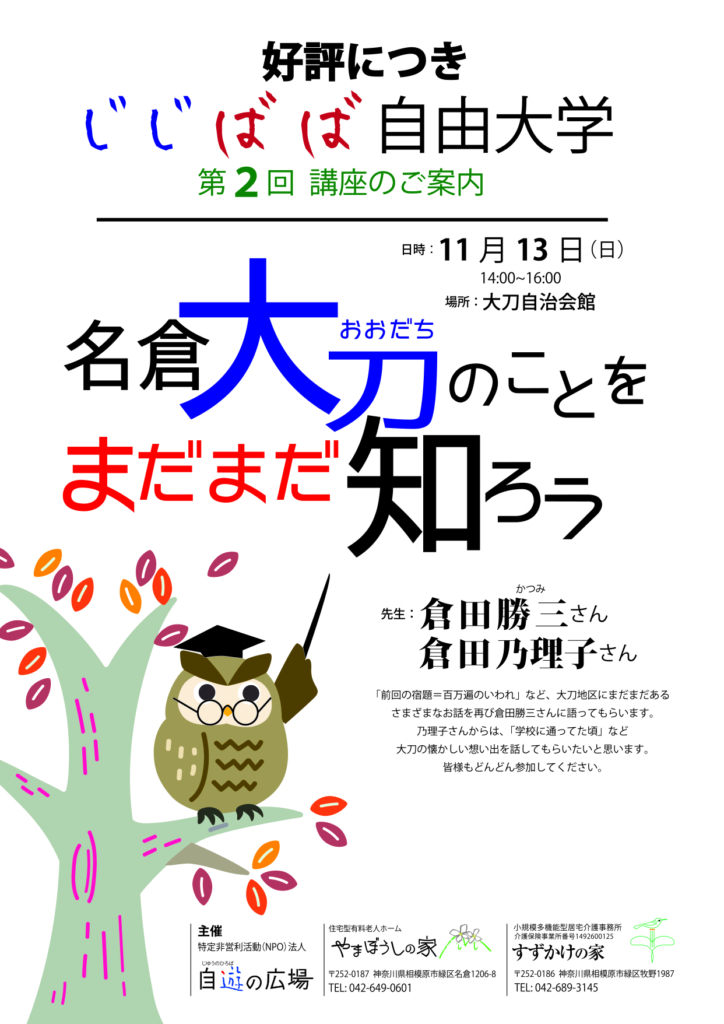 9月に開催したじじばば自由大学が好評でしたので、引き続き名倉・大刀(おおだち)を知る講座を開催します。 詳しくはこちら 名倉・大刀のことをまだまだ知ろう