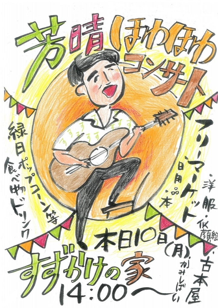 ぐるっとお散歩篠原展 10月9日(日)~10日(月・祝) 4年ぶりとなる「ぐるっとお散歩篠原展」、すずかけの家も参加します!(10日のみ、10時から16時) ★10日14時から 芳晴のほわほわコンサート ★すずかけ縁日綿あめ、ポップコーン、フランクフルト、玉... -