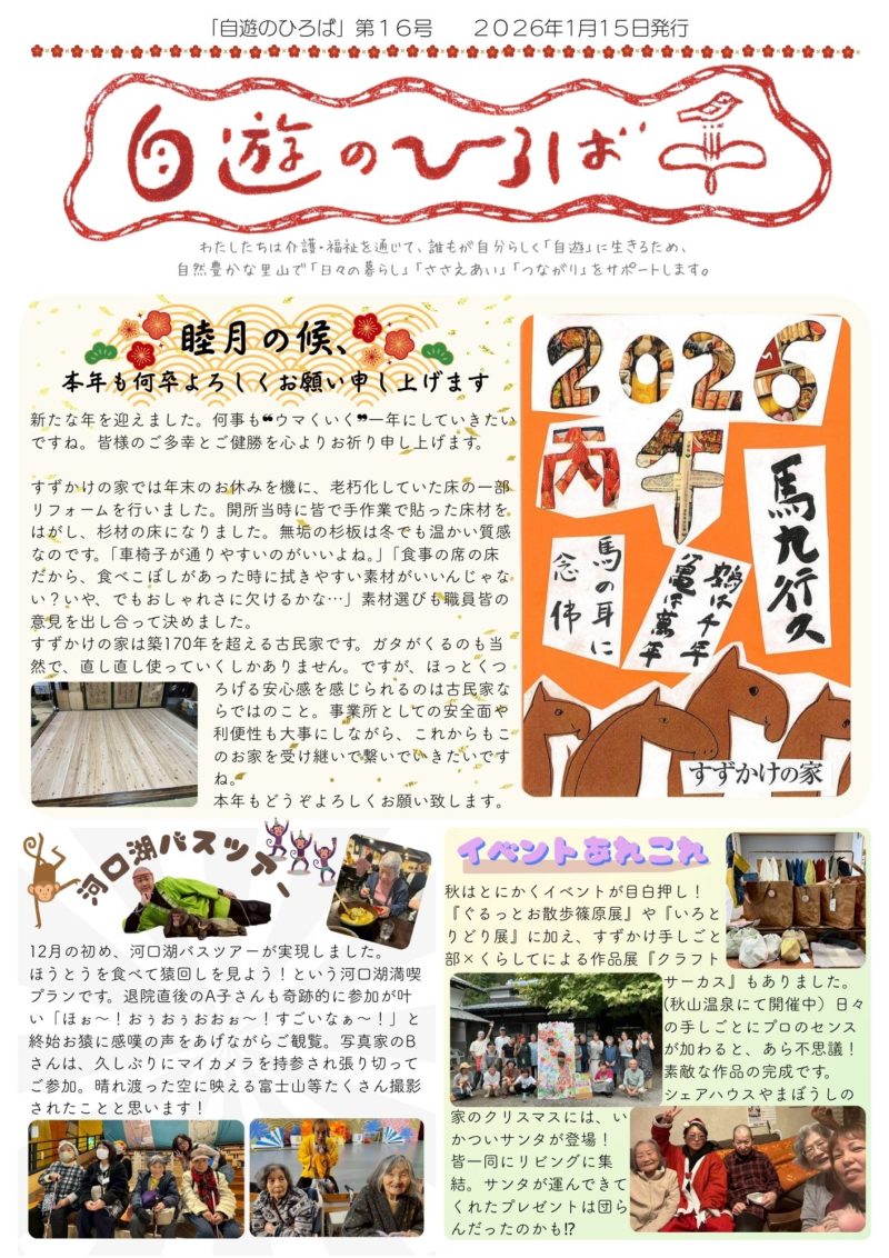 会報「自遊のひろば」第16号ができました! 2026年 今年も何卒よろしくお願いいたします。 好評連載「介護のいろは」もおたのしみに! →自遊のひろば16号はこちら 表 裏 &n…