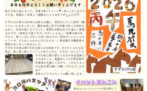 会報「自遊のひろば」第15号ができました! 猛暑の夏が過ぎやっとこさ過ごし易い気候になりました。 実りの秋です!栗、柿、サツマイモ、、すずかけの家では地域で獲れる作物で食欲も満たさる予感! 秋のイベントも盛沢山で楽しみで...